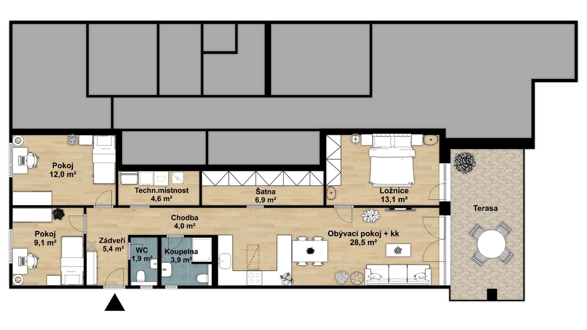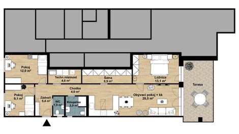 Představte si ráno, kdy vás probudí sluneční paprsky jemně pronikající skrz předokenní žaluzie a vy se s hrnkem voňavé kávy usadíte na slunné terase. Kolem vás ticho, zpěv ptáků a pocit, že jste přesně tam, kde máte být. Tohle není sen. Tohle může být váš nový domov. Nabízíme k prodeji moderní byt o dispozici 4+kk a celkové podlahové ploše 94,55 m2 (dle nařízení vlády č.366/2013 Sb.), umístěný v jižní části novostavby čerstvě zkolaudovaného rodinného domu. V domě se nacházejí jen dvě bytové jednotky, což zajišťuje dostatek soukromí a klidu. Dům je situován v nové rezidenční lokalitě na okraji Přelouče, v ulici V Sadech - tam, kde město plynule přechází v přírodu. Prostor, kde se snoubí design s pohodlím Byt tvoří vstupní hala, prostorný obývací pokoj s kuchyňským koutem, chodba, tři neprůchozí pokoje, koupelna se sprchovým koutem a WC, samostatné WC a velkorysé úložné prostory - šatna a technická místnost. Do obytných místností jsou dovedeny datové rozvody, v technické místnosti je provedena příprava na napojení na internet (optický kabel). Moderní kuchyňská linka s vestavnými spotřebiči přímo vybízí k vaření pro rodinu i přátele. Plastová okna s trojskly a předokenními žaluziemi zajistí, že uvnitř vládne klid a příjemná teplota - ať už venku panuje letní vedro, nebo zimní mráz. Vytápění zajišťuje centrální teplovzdušná vytápěcí a větrací jednotka a díky tepelnému čerpadlu budete mít radost z nízkých účtů za energie. Váš vlastní kousek zahrady K bytu náleží vlastní pozemek o velikosti 122 m2, kde na vás čeká částečně krytá terasa, ideální pro letní snídaně i podvečerní posezení. Menší zahrádka s prostorným zahradním domkem (12,4 m2) je jako stvořená pro pěstování bylinek, dětské hry nebo prostě jen chvíle klidu s knihou v ruce. Parkování? Pohodlně přímo u domu na společném pozemku. V blízkosti domu vede cyklostezka vinoucí se přírodou - ideální pro ranní běh, odpolední procházku s dětmi nebo víkendový výlet na kole. Přelouč je příjemné, dynamicky se rozvíjející město se širokou občanskou vybaveností. A když budete chtít do většího města? Pardubice jsou dostupné do pouhých 10ti minut vlakem, Praha za necelou hodinu. Pokud toužíte po klidném a komfortním bydlení s vlastní zahradou, neváhejte a domluvte si s makléřem nezávaznou prohlídku. Těšíme se na vás.